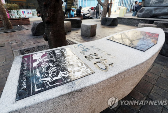 (부산=연합뉴스) 김재홍 기자 = 15일 오전 부산 부산진구 롯데백화점 부산본점 인근에 황보영국 열사를 기리는 오월 걸상이 설치돼 있다. 5·18기념재단과 오월걸상위원회가 관련 단체와 전국적으로 추진하는 오월 걸상은 누구나 앉아서 편히 쉬며 5·18민주화 운동, 민주주의, 인권 등을 생각하자는 취지로 시작된 사업이다. 노동자였던 황보영국 열사는 1987년 5월 17일 부산상고(현 개성고) 앞에서 '독재타도' 등을 외치며 분신해 일주일 뒤 유명을 달리했다. 2018.1.15