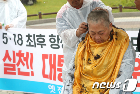 (서울=뉴스1) 구윤성 기자 = 5.18 광주민주화운동 희생자 유가족이 26일 오전 서울 종로구 청와대 앞 분수광장에서 옛 전남도청 복원을 촉구하며 삭발하고 있다. 2018.6.26/뉴스1 kysplanet@