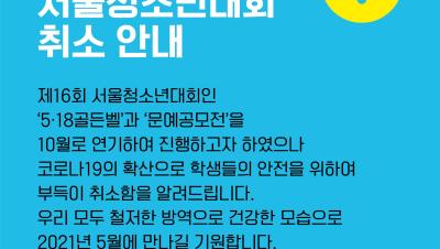 공지사항 · 5.18기념청소년대회 제16회 서울청소년대회 취소 안내 <제16회 서울청소년대회 취소 안내> 제16회 서울청소년대회인 ‘5.18골든벨’과 ‘문예공모전’을 10월로 연기하여 진행하고자 하였으나 코로나19의 확산으로 학생들의… 2020-08-24