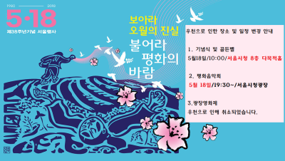 공지사항 · 5.18민주화운동 서울행사 5.18제38주년 기념 서울행사-장소 및 일정 변경 안내 5·18민중항쟁 제38주년기념 서울행사 우천으로 인한 장소 및 일정 변경 안내 1. 기념식 및 골든벨 5월18일/10:00/서울광장->5월18일… 2018-05-16