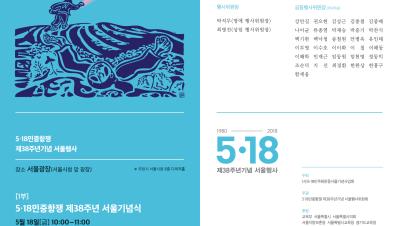 공지사항 · 5.18민주화운동 서울행사 5ㆍ18민주화운동 제38주년기념 서울 행사 일정 안내 <5ㆍ18민주화운동 제38주년기념 서울행사> 행사목적 : _ 5ㆍ18민주화운동 기념, 선양 _… 2018-05-11