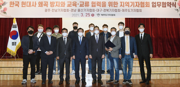 제주도기자협회(회장 박정섭)와 광주·전남기자협회(회장 최권일), 경남·울산기자협회(회장 조윤제), 대구·경북기자협회(회장 진식)는 25일 제주4·3평화공원에서 현대사 왜곡 방지를 위한 교육·교류 협력을 위한 협약식을 개최했다.