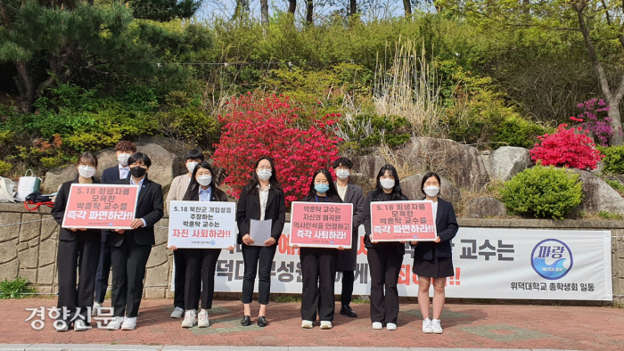 © 경향신문 위덕대 총학생회 소속 학생들이 지난 4월16일 학교 정문에서 박훈탁 교수의 파면을 촉구하며 시위를 벌이고 있다. 위덕대 총학생회 제공