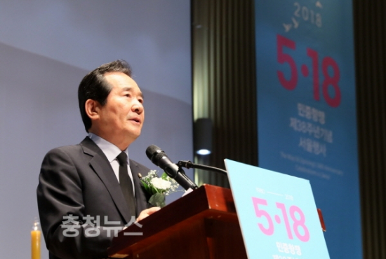 정세균 국회의장은 18일 오전 서울시청에서 열린 5.18 민주항쟁 제38주년 기념 서울행사에 참석해 대표로 헌화·분향한 뒤 기념사를 했다.